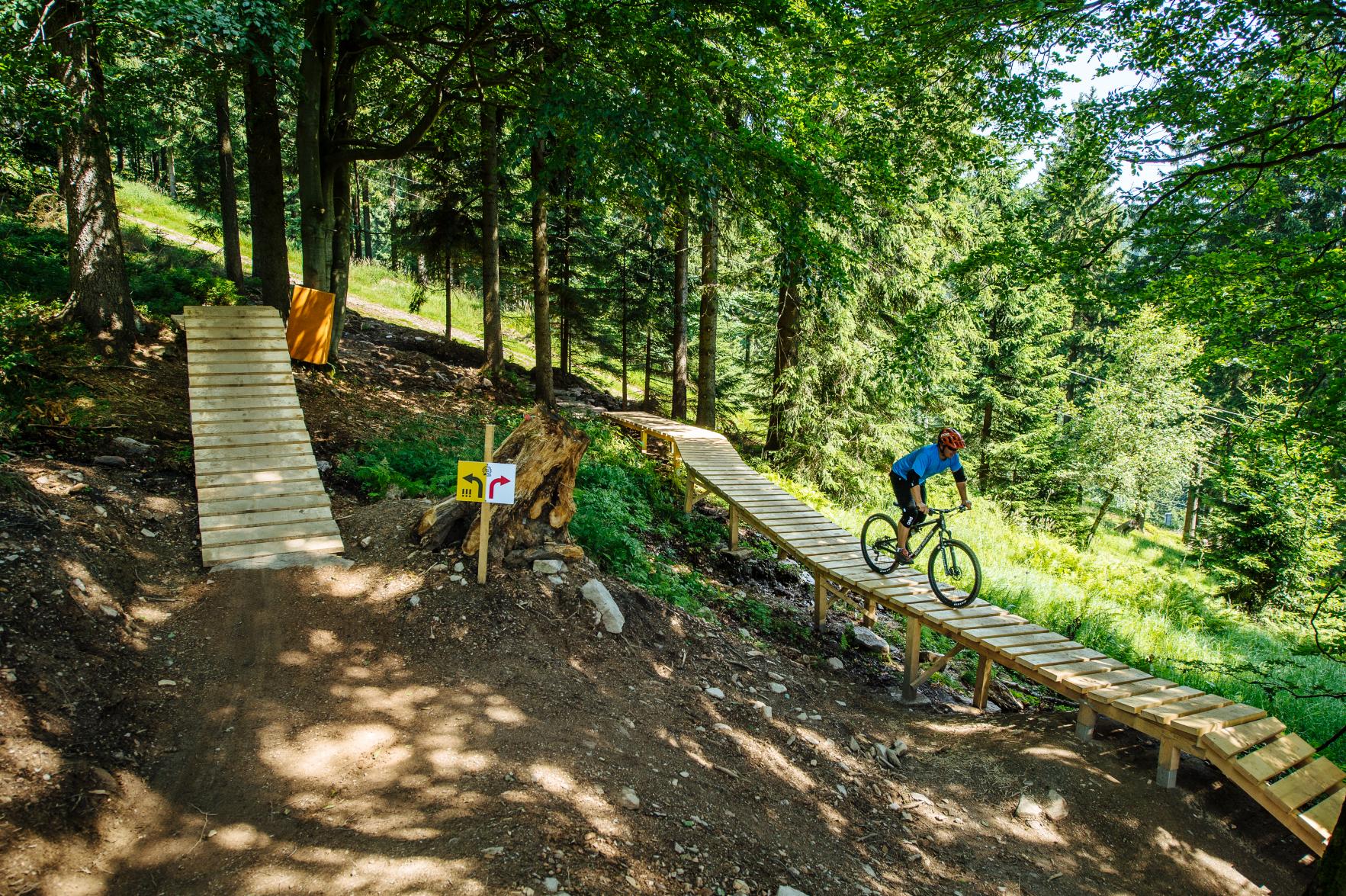 Bikepark Říčky v Orlických horách nabízí tři traily různé obtížnosti, každý s délkou přibližně dva kilometry a převýšením 250 m. Modrý trail je ideální pro začátečníky a rodiny s dětmi, obsahuje klopené zatáčky a terénní vlny. Červený trail je středně náročný s technickými pasážemi, kamennými úseky a dřevěnými lávkami. Černý trail je určen zkušeným jezdcům s překážkami jako kořeny a kameny. Pohodlný výjezd na start zajišťuje lanovka. Areál má také půjčovnu kol, včetně celoodpružených modelů, ochranného vybavení a skills centrum pro nácvik techniky. Po jízdě se můžete občerstvit v restauraci s terasou.
